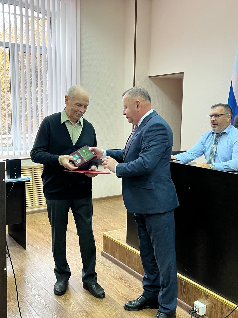 С замечательным юбилеем нашего уважаемого ветерана!!!В торжественной обстановке от имени коллектива 1- го Западного окружного военного суда заместитель председателя суда Кунцевич Ю.М. поздравил с 80 – летним юбилеем председателя Псковского гарнизонного военного суда в почетной отставке Дяченко Андрея Ивановича и вручил ему памятный знак «100 лет 1-му Западному (Ленинградскому) окружному военному суду» и зачитал поздравительный адрес.